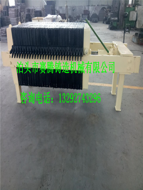 板框压滤机滤板由交替排列的滤板和滤框构成一组滤室。滤板的表面有沟槽,其凸出部位用以支撑滤布。滤框和滤板的边角上有通孔,组装后构成完整的通道,能通入 悬浮液、洗涤水和引出滤液。板、框两侧各有把手支托在横梁上,由压紧装置压紧板、框。板、框间的滤布起密封垫片的作用。